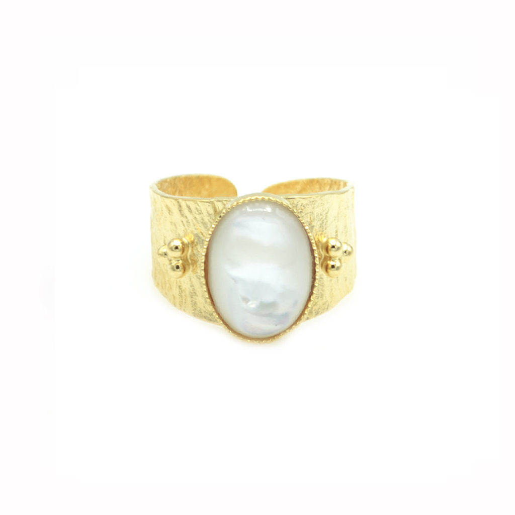 Bague dorée ornée d’un cabochon de pierre fine. Taille ajustable, idéale en cas de doute pour un cadeau !