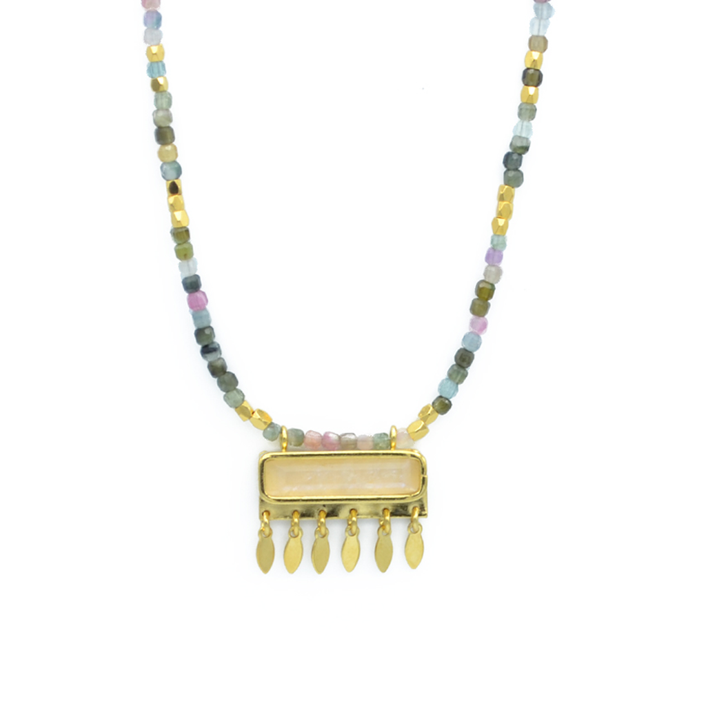 MYRIAM : Collier perles pendentif rectangle empierré, orné de pampilles